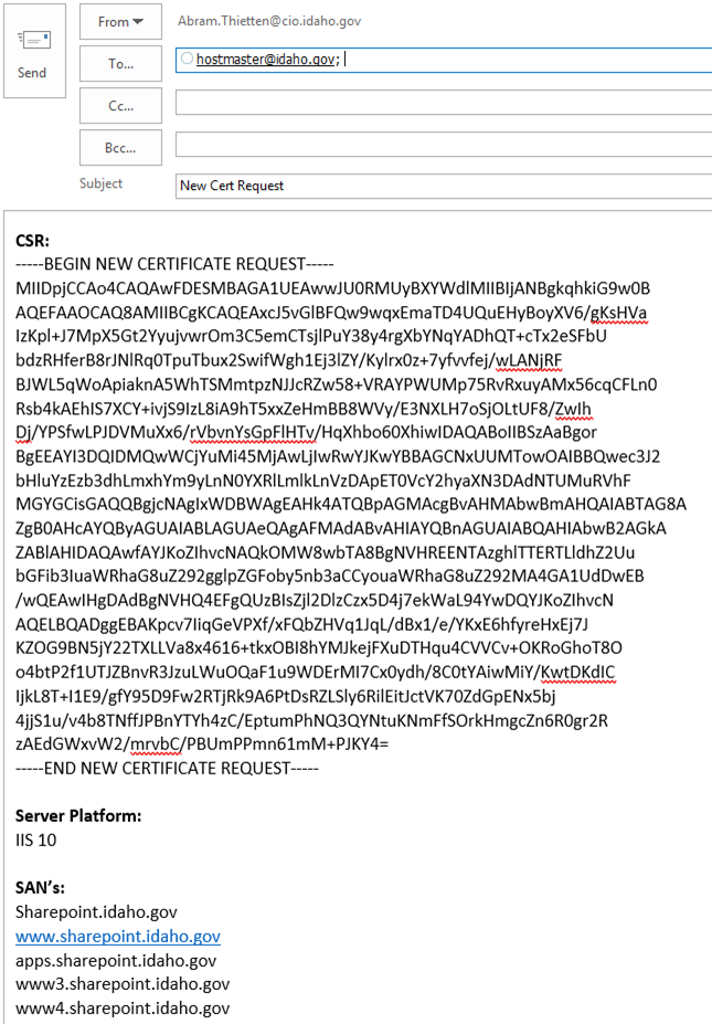 Our *.idaho.gov wildcard SSL certificate will expire on November 14th. We have purchased a new *.idaho.gov wildcard certificate and you can start sending us your CSR's so we can issue you the new certificate which will expire on 4/7/2020 (2 years is the maximum) I would recommend if your domain(SANs) is listed below to do this ASAP.