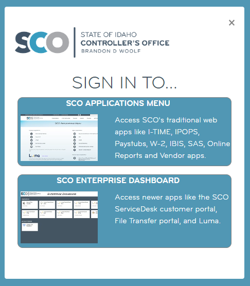 To sign up for training, you need to be able to access the SCO Enterprise Dashboard<https://www.sco.idaho.gov/LivePages/scohome.aspx> (the below screen pops up after you click "Sign In" in the upper right hand corner). Keep in mind, your credential for the Enterprise Dashboard are different than your credentials for the Applications Menu sign in. If you need assistance getting access, contact the SCO Helpdesk at (208) 334-3100 or info at sco.idaho.gov<mailto:info at sco.idaho.gov>. Please also note that the Enterprise Dashboard requires dual verification to sign in (i.e., if you decide to use your cell phone to authenticate, you'll need to download Duo Mobile).